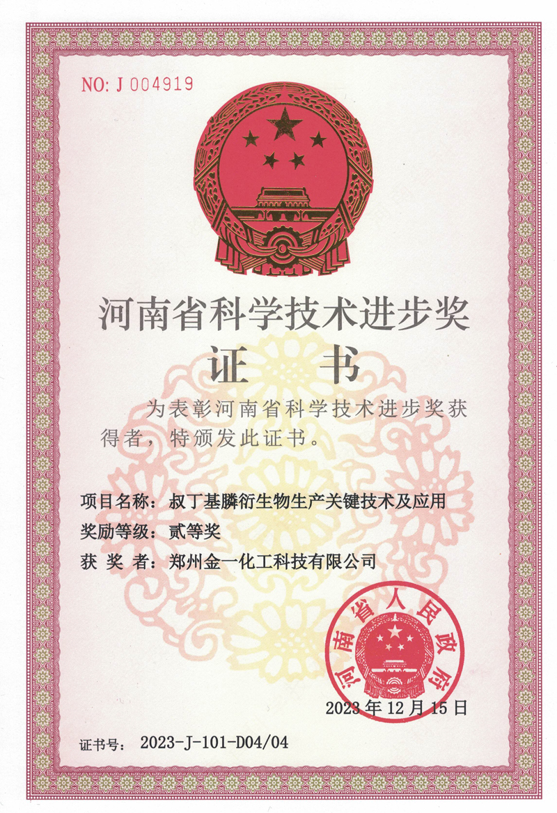 2023年12月,鄭州金一化工科技有限公司作為完成單位參與的項目《叔丁膦衍生物生產關鍵技術及應用》獲得2023年河南省科技進步二等獎。該項目聚焦叔丁膦衍生物規(guī)?;a中經濟性、安全性、效率和選擇性等關鍵技術創(chuàng)新,開發(fā)了適合國內生產條件和市場需求的規(guī)?;a工藝,研發(fā)了系列叔丁膦衍生物產品,形成了自主的知識產權體系,經濟、社會效益顯著。